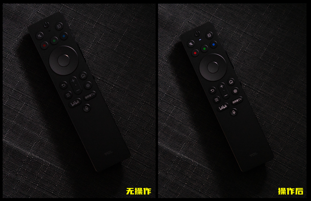 遥控器带有按键发光设计,在暗光下就不用摸黑操作了。