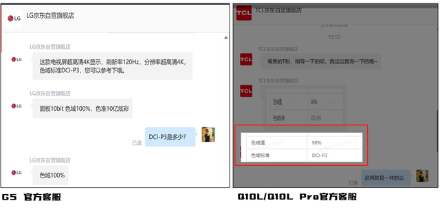 而在色彩方面,今年新发布的LG旗舰G5的P3色域覆盖为100%,今年发售的TCL Q10L与Q10L Pro,P3色域覆盖达到了98%,你看,P3色域覆盖上差距只有2%了,这是肉眼几乎无法分辨的差距了。