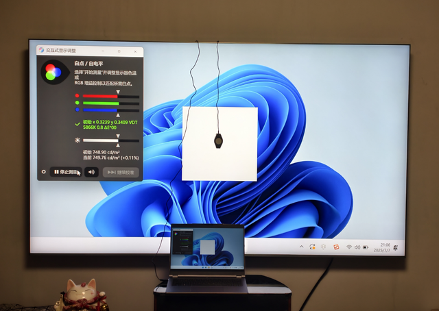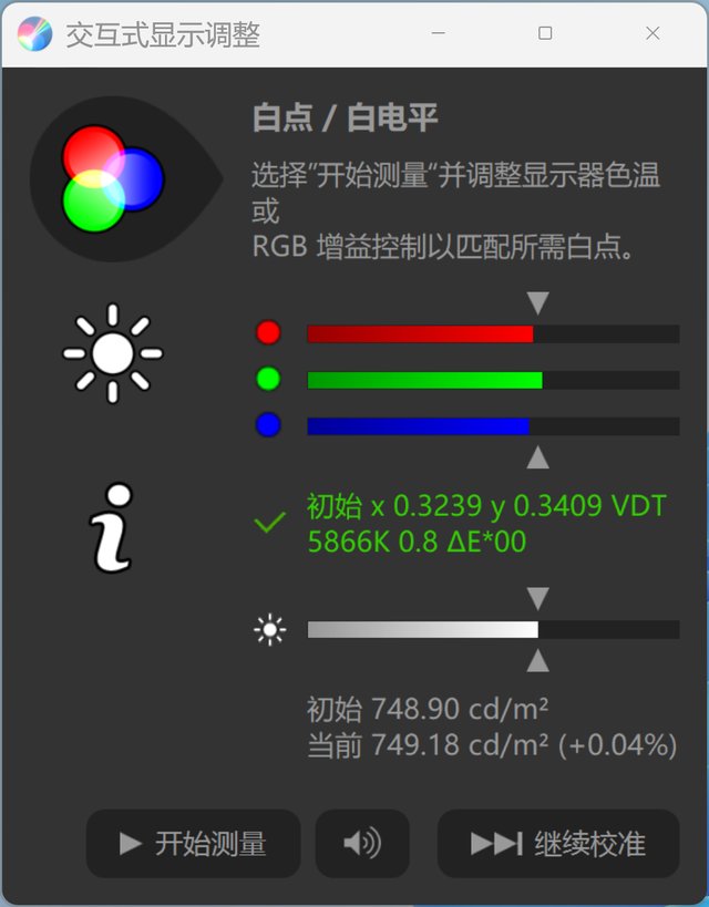 Filmmaker Mode模式下,校色仪检测出厂状态的RGB白点平衡就是完美的,软件测出全屏亮度749cd/㎡。