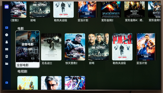 而新的媒体中心通过在网络上自动搜索影片的海报、简介等信息并整理成海报墙,并按照电影、电视剧进行分类,点击全部会进入类似的画面。