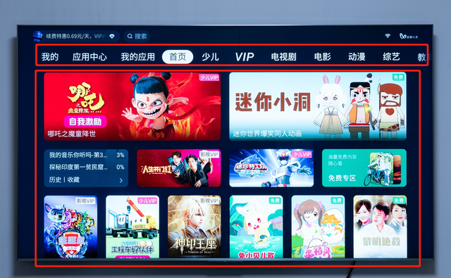 上图是常见的电视标准桌面,顶部是板块名称,下面是版面内容,所有的菜单、模块都是由厂家提供,无法修改调整,信息很多,广告也不少。