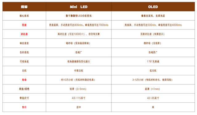 咱们先从理性分析,OLED与Mini LED差距在哪,上图是一些主要差距,其中红色是资深电影爱好者比较在意的四个参数。