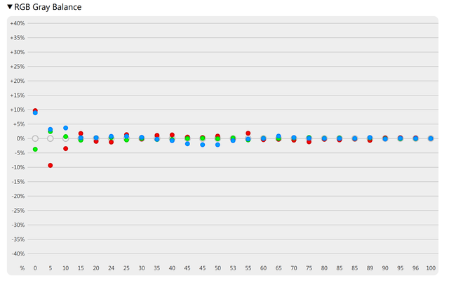 RGB灰平衡方面,亮度只要超过10%,直到100%几乎是非常完美的效果。