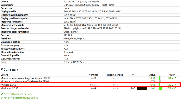 使用视频大模型测得色准平均ΔE=0.43,专业级别。